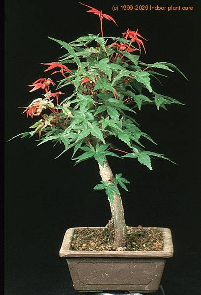 This maple is native to China and Japan. Its botanical name comes from its leaves, which have 5 or more deep lobes and vaguely resemble a human hand. It is a popular bonsai subject in Japan. The bark on young branches and trunks is usually green (may be red on some varieties) and turns brown or light gray with age. There are many different varieties of A. palmatum, including thread-leaf or lace-leaf varieties and both green and red varieties. The red varieties seem to be more popular as bonsai.