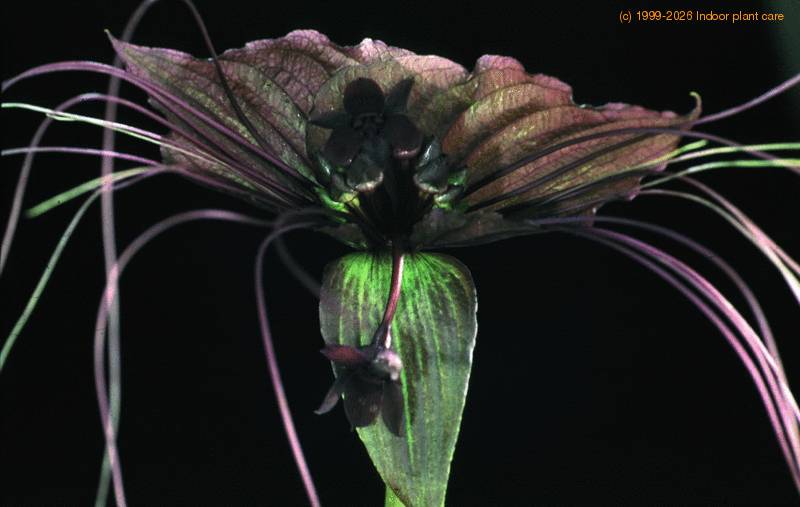 Tacca chantrieri is a tropical plant that loves a high level of air humidity. This can be enhanced by ensuring that the axils between the leaves and the stem are always filled with water. This also encourages the budding of the next flower. Keep the compost moist, but empty surplus water from the drip tray. Keep away from the direct sunlight, and feed regularly.